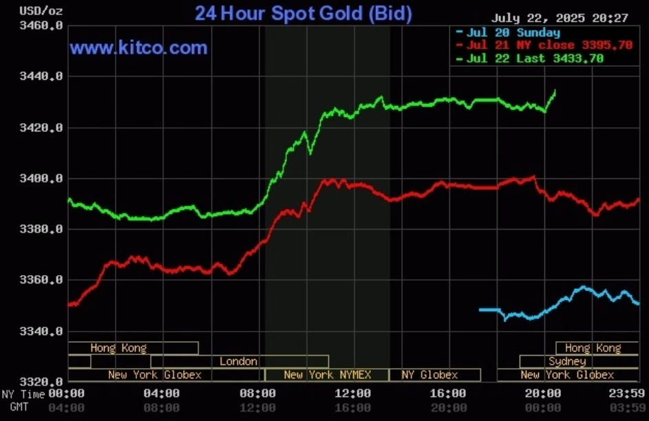 Chốt phiên giao dịch 22/7, giá vàng thế giới giao ngay tăng gần 35 USD lên 3.423 USD một ounce. Đây là mức cao nhất kể từ phiên 16/6. Hiện tại, giá vẫn tiếp tục đi lên, chạm 3.431 USD.