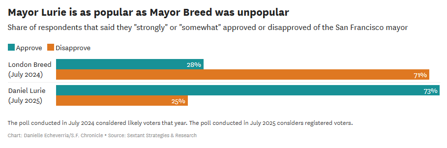 Cuộc thăm dò, khảo sát 961 cử tri đã đăng ký từ ngày 9 đến ngày 13 tháng 7, cho thấy gần ba phần tư người dân San Francisco tán thành công việc mà Lurie đã làm cho đến nay. Tỷ lệ ủng hộ cao ngất ngưởng của ông gần như hoàn toàn ngược lại với đánh giá của cử tri về hiệu suất làm việc của Breed vào tháng 7 năm ngoái: Vào thời điểm đó, chỉ hơn một phần tư số người được hỏi cho biết họ tán thành hiệu suất làm việc của thị trưởng.
