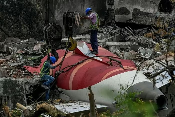 Công nhân dọn dẹp hiện trường vụ rơi máy bay Air India số hiệu AI171 tại Ahmedabad, Ấn Độ, hồi tháng 6. Ảnh: The New York Times.