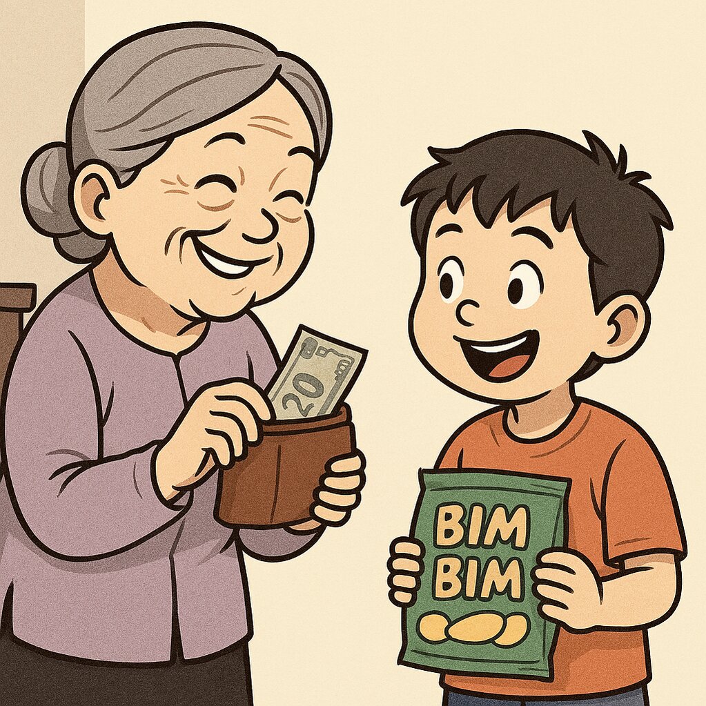 “Bà ngoại em hiền lắm. Mỗi lần mẹ mắng em, bà lại ra bênh, nói em còn nhỏ. Bà hay cho em tiền đi mua bim bim, bánh snack, hoặc kem dù trời có lạnh như trong tủ đá. Có lần bà không có tiền, bà lấy luôn ví của ông rồi nhẹ nhàng rút tờ 20 nghìn. Ông thấy mất tiền, nghi ngờ con mèo nhưng con mèo thì không có tài móc ví.”