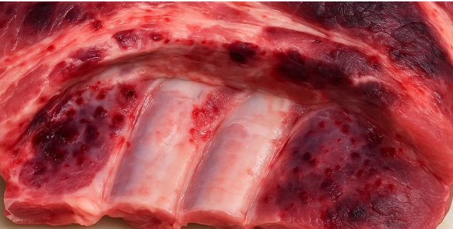 Màu sắc thịt bất thường: Thịt heo nhiễm bệnh thường có màu nâu xám, đỏ bầm hoặc xanh nhạt thay vì màu đỏ tươi tự nhiên của thịt khỏe mạnh.
