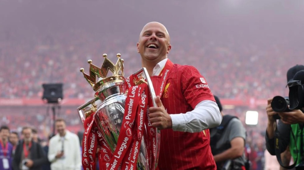 HLV Arne Slot nâng chức vô địch Ngoại hạng Anh mùa 2024-2025. Ảnh: Liverpool FC