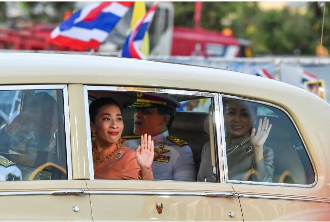 Công chúa Thái Lan Bajrakitiyabha Mahidol (áo cam) vẫy chào người dân trên đường đến Cung điện Hoàng gia ở Bangkok năm 2020, phía sau là Quốc vương Maha Vajiralongkorn và Hoàng hậu Suthida. Ảnh: AFP