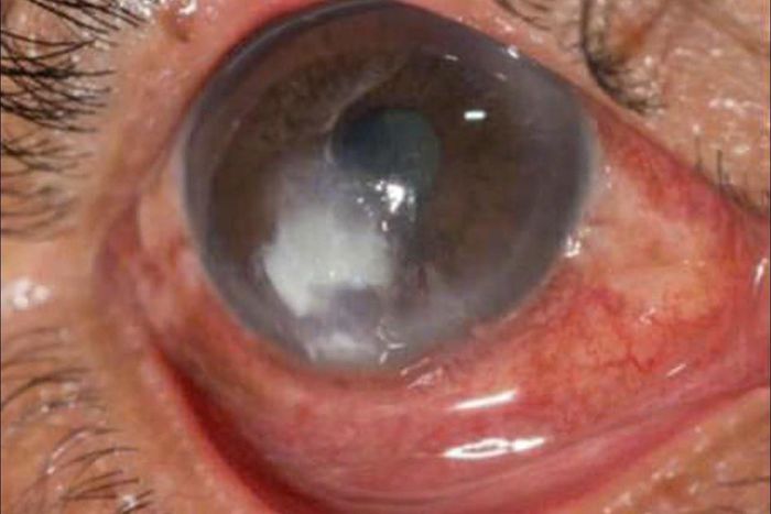 Sau khi thăm khám chuyên sâu và soi kính hiển vi, các bác sĩ xác định bệnh nhân mắc viêm loét giác mạc. Đây là bệnh lý nghiêm trọng, có thể để lại sẹo giác mạc, gây suy giảm thị lực vĩnh viễn, thậm chí dẫn đến mù lòa nếu không được điều trị kịp thời.