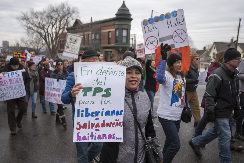 Khoảng 500 người đă tập trung để ủng hộ DACA (Chương tŕnh hoăn trục xuất đối với người nhập cư khi c̣n nhỏ) và TPS (Quy chế bảo vệ tạm thời) dành cho các quốc gia như El Salvador và Haiti. (Nguồn: Fibonacci Blue)