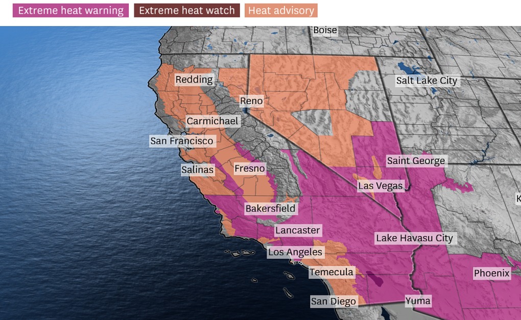 Cảnh báo nắng nóng tại khu vực tây nam Mỹ ngày 20/8. Đồ họa: SFChronicle