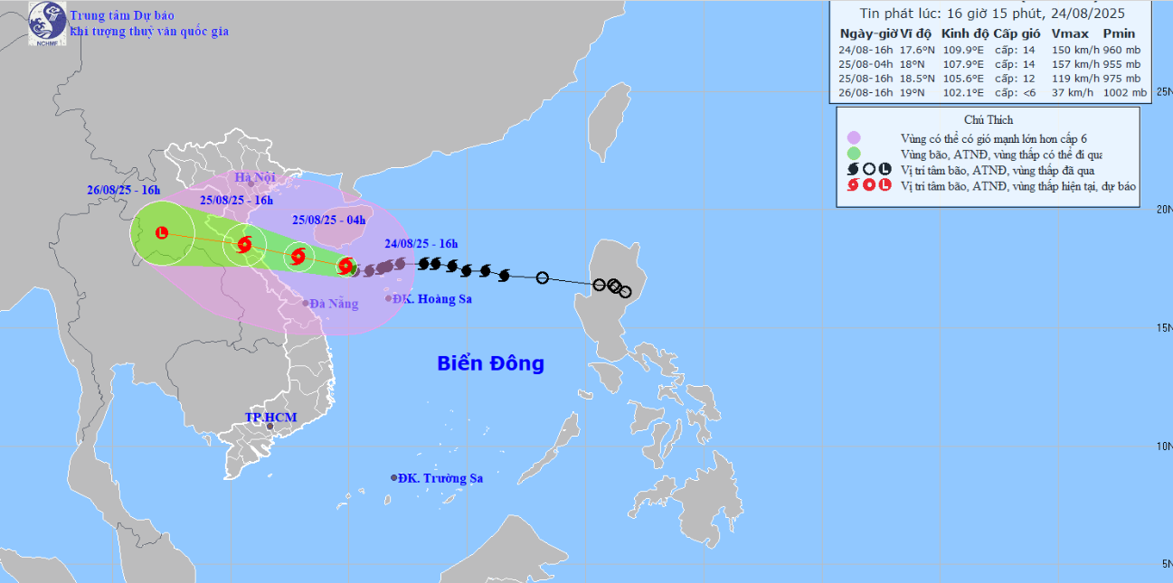 Theo Trung tâm Dự báo Khí tượng thủy văn Quốc gia, lúc 16h ngày 24/8, tâm bão ở 17,6°N – 109,9°E, cách Nghệ An 470km, Hà Tĩnh 450km, Bắc Quảng Trị 390km về phía Đông. Sức gió mạnh nhất cấp 13–14 (134–166 km/h), giật cấp 16. Bão di chuyển hướng Tây, tốc độ 20 km/h và còn có khả năng mạnh thêm.