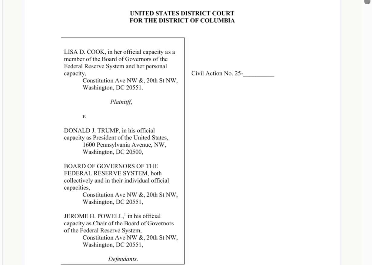 Hôm thứ Năm, Thống đốc Hội đồng Dự trữ Liên bang Lisa Cook đã kiện Tổng thống Donald Trump để ngăn chặn nỗ lực chưa từng có tiền lệ của ông nhằm sa thải bà, mở ra một cuộc chiến pháp lý có thể sẽ kết thúc tại Tòa án Tối cao.