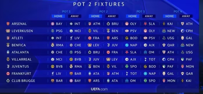 Ở nhóm hạt giống số 2, Arsenal phải đối đầu 3 đối thủ sừng sỏ gồm Inter, Atletico Madrid và Bayern Munich. Trong khi đó, Leverkusen của HLV Erik ten Hag có lịch thi đấu đầy khó khăn, lần lượt trước PSG, Man City, Vilalrreal, Benfica, PSV, Olympiacos, Newcsatle và Copenhagen.