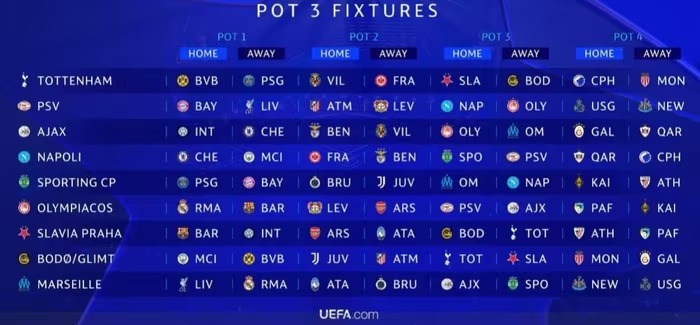 Trong khi đó, phần mềm tự động của UEFA xếp nhà đương kim vô địch PSG chạm trán toàn đối thủ sừng sỏ (Bayern, Barcelona, Ataltana, Leverkusen, Tottenham, Sporting, Newcastle và Bilbao). Thầy trò HLV Luis Enrique sẽ phải thi đấu hết mình ngay từ giai đoạn League Phase để thực hiện tham vọng bảo vệ ngôi vương.