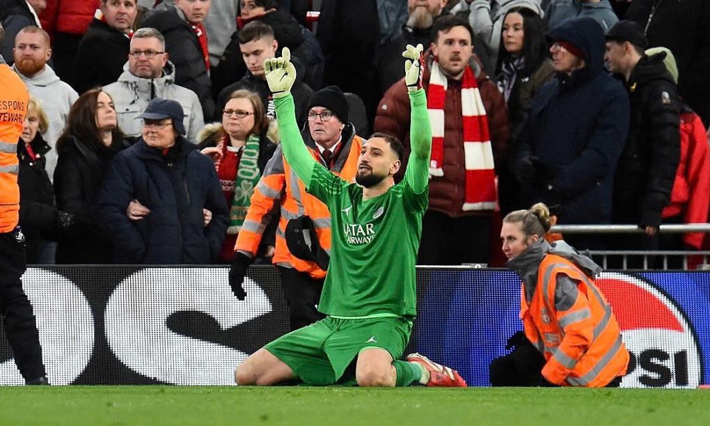 Donnarumma mừng chiến thắng của PSG trước Liverpool ở lượt về vòng 1/8 Champions League trên sân Anfield, thành phố Liverpool, Vương quốc Anh tối 11/3/2025. Ảnh: Reuters
