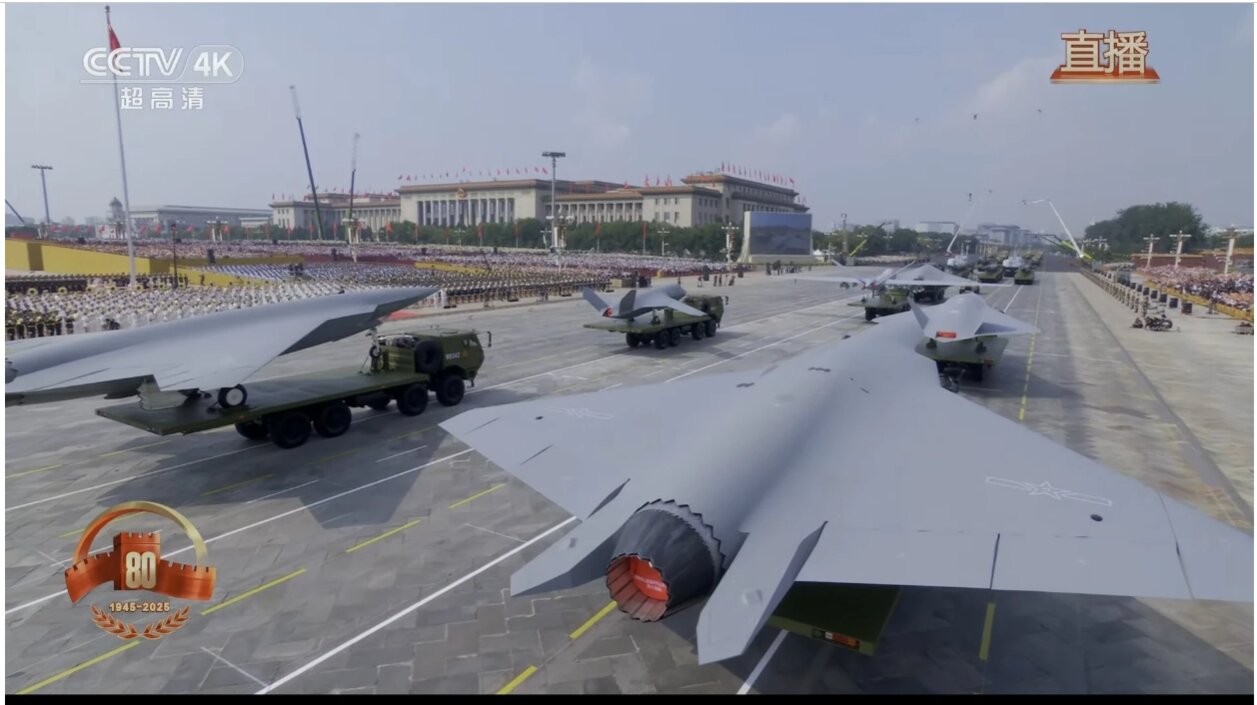 Mẫu máy bay không người lái (UAV) mới có kích thước tương đương máy bay tiêm kích hạng trung J-10 của Trung Quốc, xuất hiện cùng với các thiết kế không người lái khác trên thùng xe tải trong lễ duyệt binh ngày 3/9.