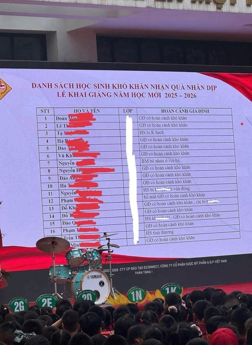 Theo đó, trong lễ khai giảng năm học mới, nhà trường đã chiếu lên màn hình danh sách học sinh khuyết tật, gia đình có hoàn cảnh khó khăn, bố mẹ bỏ nhau ở với bà... để lên nhận quà trước toàn trường.