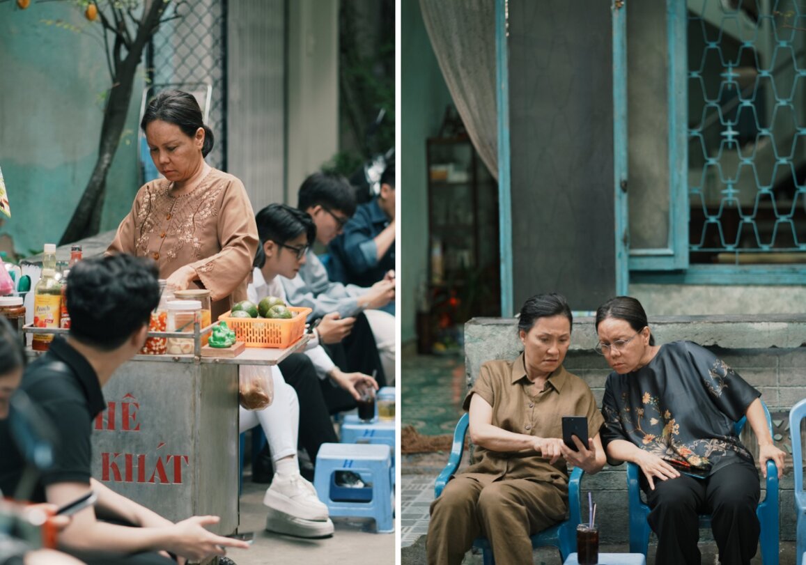 Ngay từ khâu thiết kế bối cảnh, ê-kíp chú trọng những chi tiết quen thuộc: bức tường vàng cũ kỹ, bộ bàn ghế gỗ lâu năm, xe cà phê ven đường. Trong ngôi nhà của bà Hậu, nhiều vật dụng gợi nhớ ký ức, như chiếc tủ gỗ, gam màu nâu trầm quen thuộc, góp phần khắc họa dấu vết thời gian và những khoảng lặng của một gia đình nhỏ.