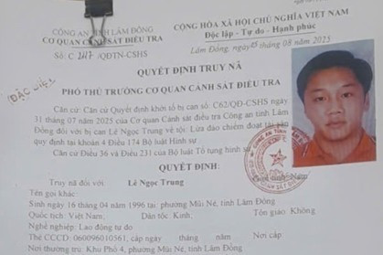 Ngày 11/9, Cơ quan Cảnh sát điều tra Công an tỉnh Lâm Đồng phát đi quyết định truy nă đặc biệt đối với Lê Ngọc Trung (SN 1996, trú phường Mũi Né, tỉnh Lâm Đồng) về tội “Lừa đảo chiếm đoạt tài sản”.