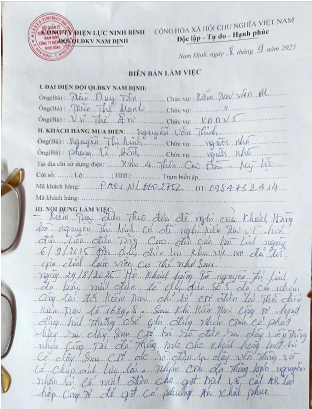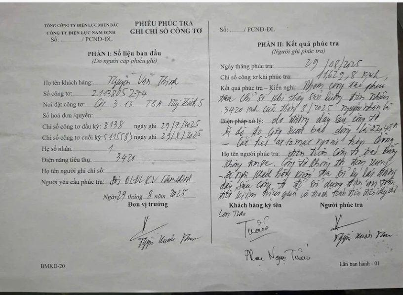 Liên quan đến sự việc, ngày 8/9, Tổ điện lực Mỹ Lộc đã có biên bản tiến hành kiểm tra và kết luận, sản lượng điện tăng bất thường (3.420 kWh) do đường dây sau công tơ bị rò điện ra dây viễn thông, dẫn tới tổn thất điện năng.