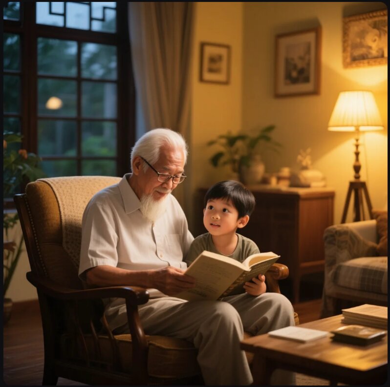 Buổi tối, ông nội đeo kính, chậm rãi lật từng trang sách, ánh đèn bàn vàng dịu hắt xuống khiến cả căn phòng yên bình lạ thường.