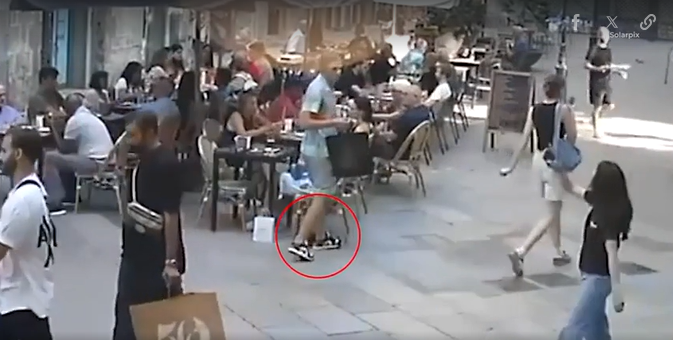 Tây Ban NhaTên trộm đi qua bàn ăn của một cặp du khách, dùng chân khều túi xách ra xa rồi cúi xuống nhặt như đồ của mình, ung dung bỏ đi.