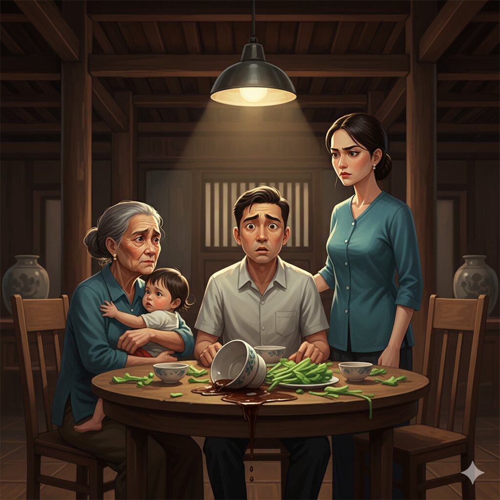 Người đàn ông ngồi giữa, chồng của Mai, bối rối đến mức chưa kịp phản ứng. Anh ngước nhìn mẹ, rồi nhìn vợ, mắt mở to như không tin nổi mọi chuyện lại vỡ òa ngay trong bữa cơm.