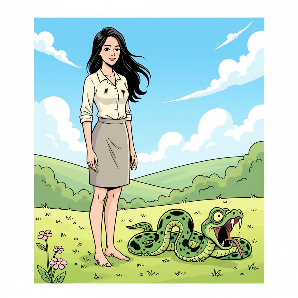 Một cô gái trẻ xinh đẹp đang thử sức gan dạ, chơi đùa với một con rắn độc. Bất ngờ, con rắn lao tới cắn ngay vào ngực cô.