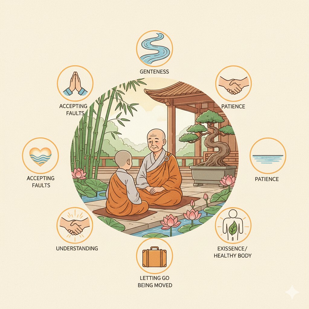 2. Thứ hai, “học nhu hòa”. Răng người ta rất cứng, lưỡi người ta rất mềm, đi hết cuộc đời răng người ta lại rụng hết, nhưng lưỡi thì vẫn còn nguyên, cho nên cần phải học mềm mỏng, nhu hòa thì đời con người ta mới có thể tồn tại lâu dài được. Tâm nhu hòa là một tiến bộ lớn trong việc tu tập.
