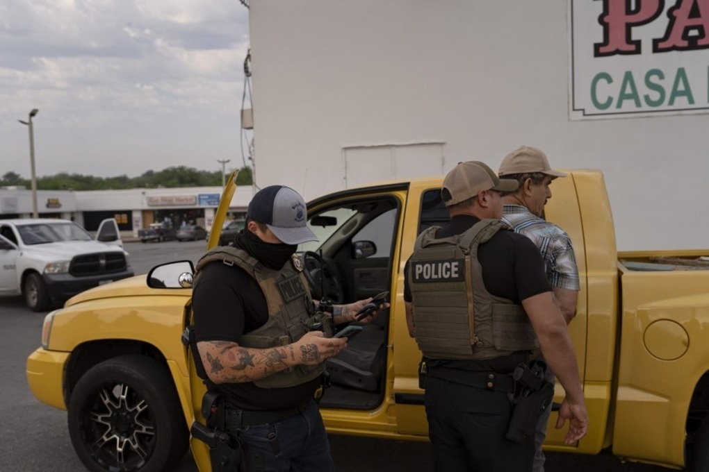 Các đặc vụ ICE kiểm tra danh tính một người đàn ông ở San Antonio, Texas, vào tháng 6. Ảnh: WSJ