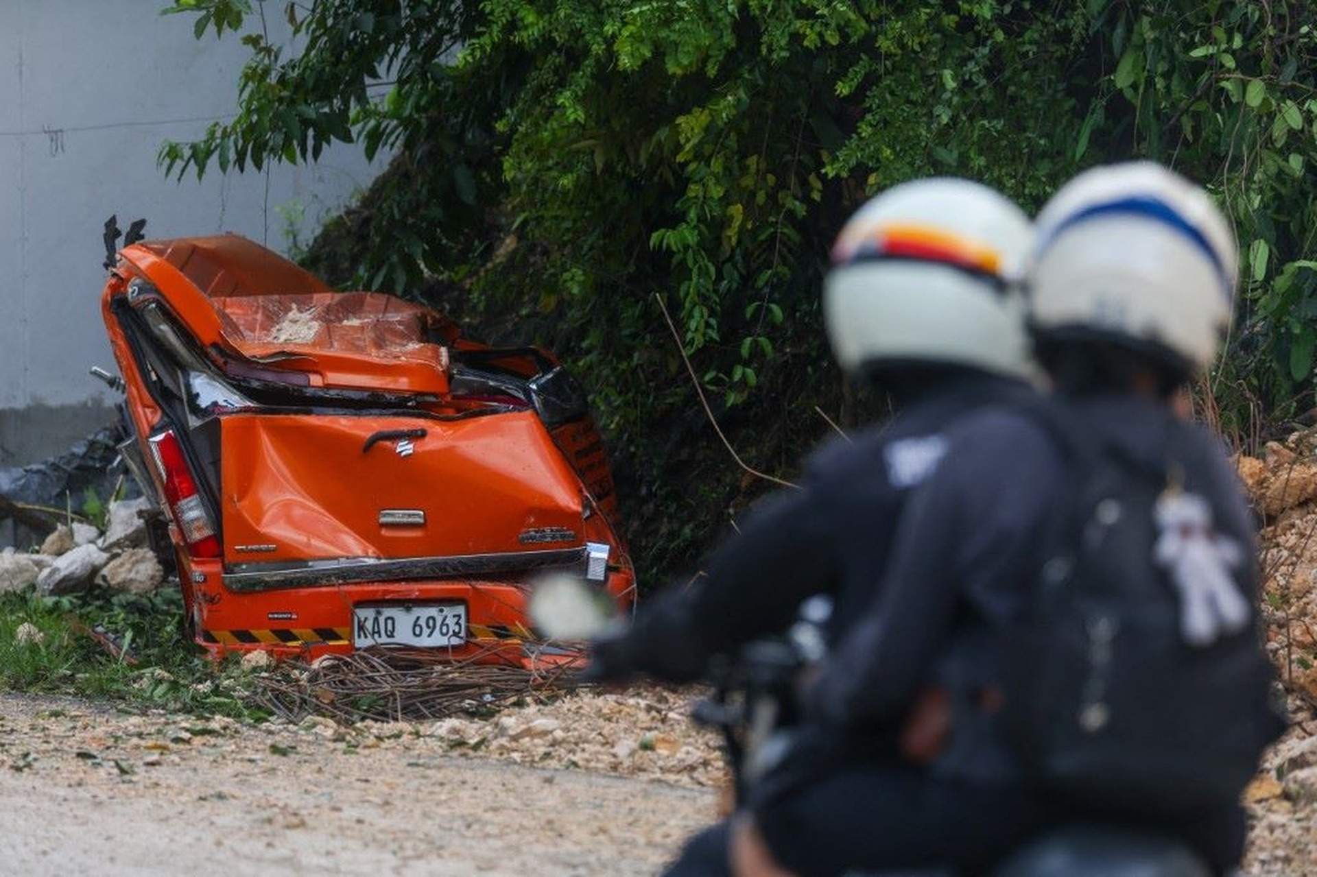 Một ô tô bị vò nát do sạt lở sau động đất ở Cebu (Ảnh: AFP).