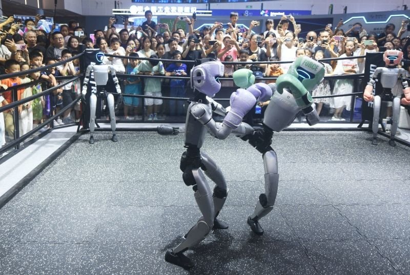 Hai robot hình người Unitree chiến đấu trên võ đài quyền anh trong một buổi trình diễn công nghệ ở Hàng Châu, tỉnh Chiết Giang, miền đông Trung Quốc vào ngày 28/9/2025. Ảnh FEATURECHINA/Newscom/Sipa USA