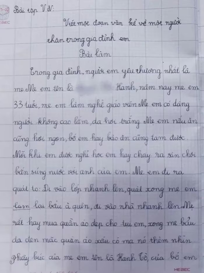 "Trong gia đình, người em yêu thương nhất là mẹ. Mẹ tên là N.T. Hạnh, năm nay mẹ em 33 tuổi, mẹ em làm nghề giáo viên. Mẹ em có dáng người không cao lắm, da hơi trắng. Mẹ em nấu ăn cũng hơi ngon, bố em hay bảo ăn cũng tạm được.