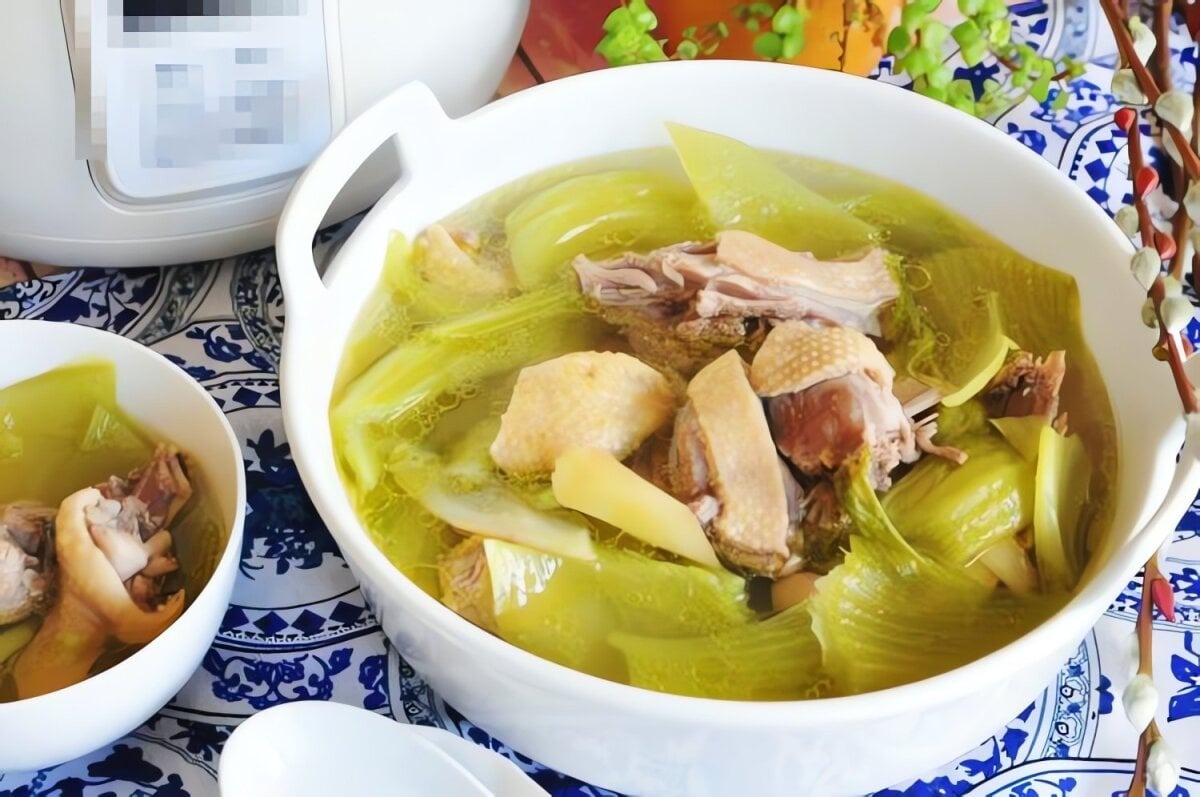 Hầm khoảng 30 phút cho thịt vịt chín mềm, cải bẹ ra hết vị ngọt.