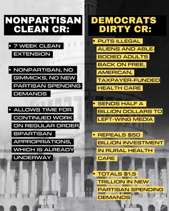 Conversely, Democrats’ “dirty” continuing resolution (CR) puts “illegal aliens and able-bodied adults back on free, American taxpayer-funded health care” and “sends half a billion dollars to left-wing media.”