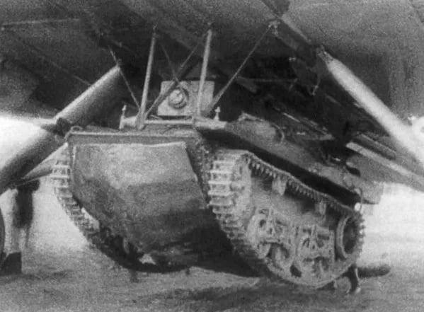 Chiếc “xe tăng có cánh KT-1” của Liên Xô được lắp vào cánh tàu lượn. Nguồn: russian7.ru.