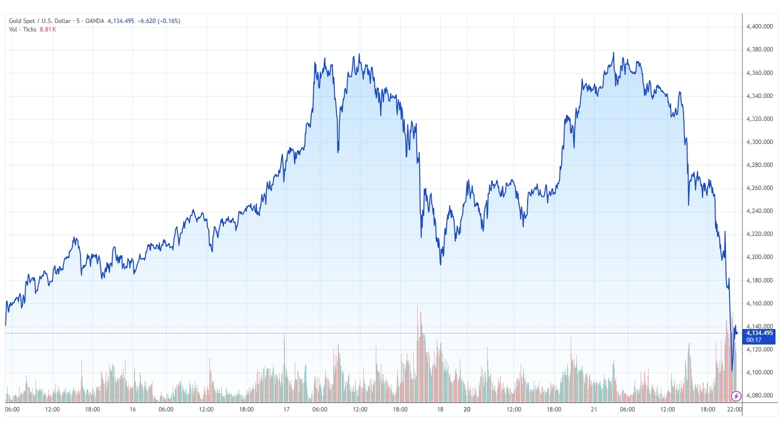 Trong phiên giao dịch vào sáng ngày 21/10, giá vàng trên thế giới giao ngay đang rơi thẳng đứng hơn 250 USD, lao dốc một mạch từ trên 4,300 USD/ounce xuống còn 4,104 USD/ounce, mức thấp nhất trong gần một tuần lễ vừa qua và là mức giảm mạnh nhất chưa từng ghi nhận trong một phiên giao dịch.