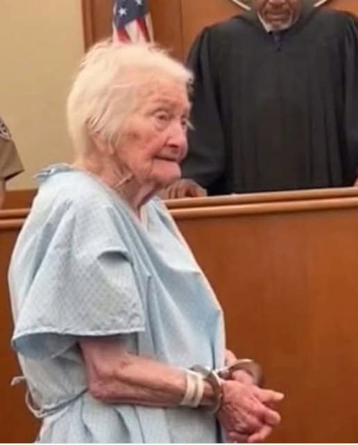 Bà đã 91 tuổi, cao chưa đến 1m50, mặc áo bệnh viện, cổ tay bị còng — trông giống một người bà yếu ớt hơn là một tội phạm bị đưa ra xét xử.