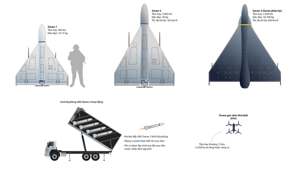Các dòng UAV Geran mà Nga đang sở hữu và quy trình phóng. Đồ họa: CNN