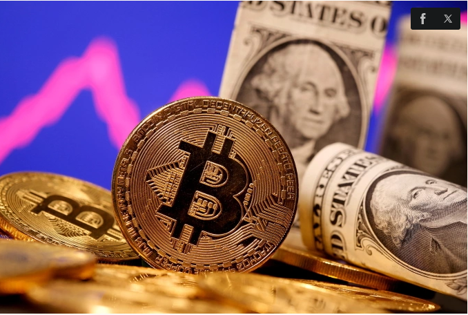 Biểu trưng của Bitcoin đặt cạnh các tờ đôla Mỹ. Ảnh: Reuters