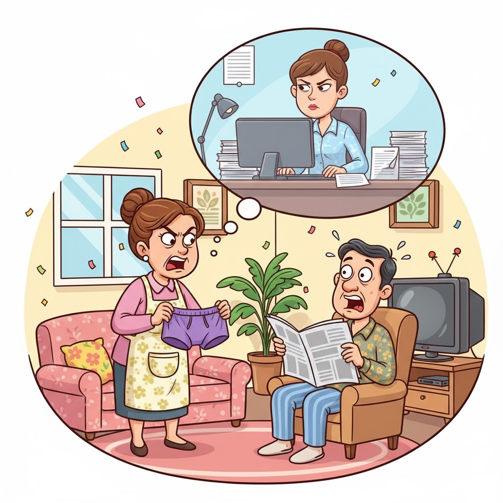 Ông chồng – giám đốc một công ty – đang ngồi đọc báo trong phòng khách thì bà vợ hùng hổ xông vào, tay cầm một chiếc quần lót màu tím.