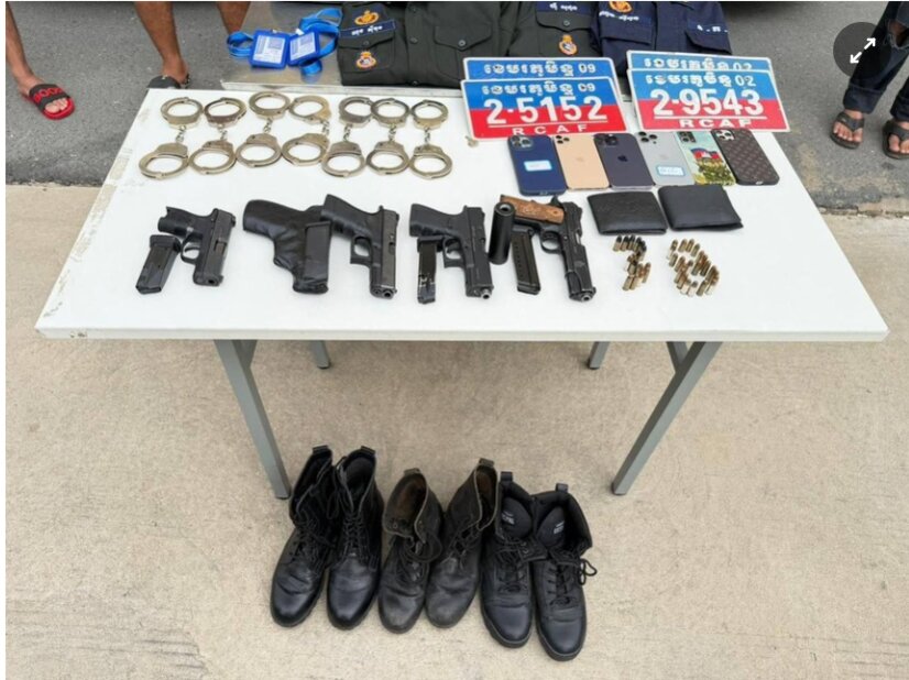 Trong chiến dịch vây bắt, cảnh sát thu giữ lượng lớn tang vật, bao gồm hai ôtô mang biển số Kampot và Phnom Penh, bốn khẩu súng, sáu điện thoại di động, 38 viên đạn, 7 còng số tám, bốn bộ quân phục hiến binh, hai thẻ hiến binh bản sao và một ba lô. Những tang vật trên cho thấy nhóm tội phạm đã chuẩn bị kỹ lưỡng cho các hoạt động mạo danh và gây án.