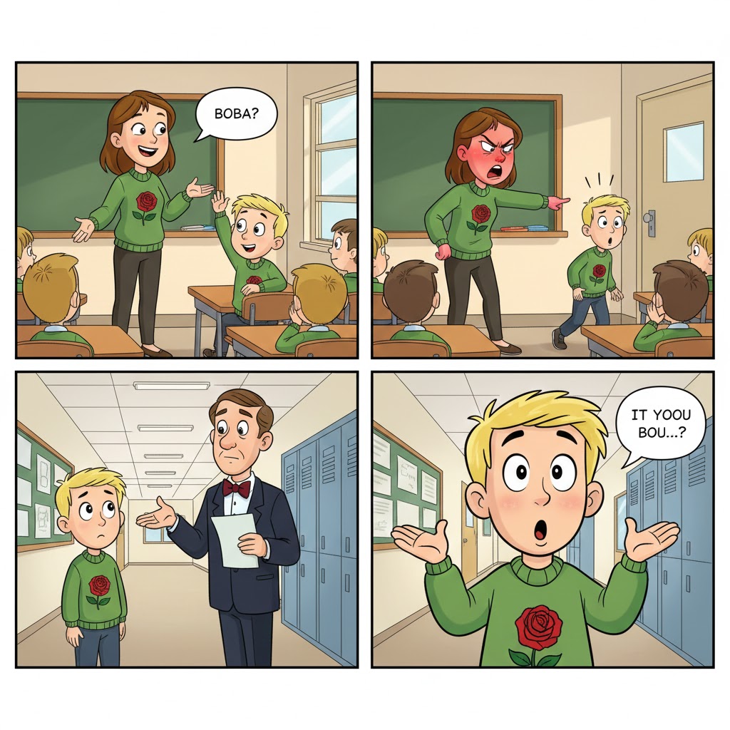 Cô giáo đỏ mặt đuổi Vova ra đứng hành lang.
