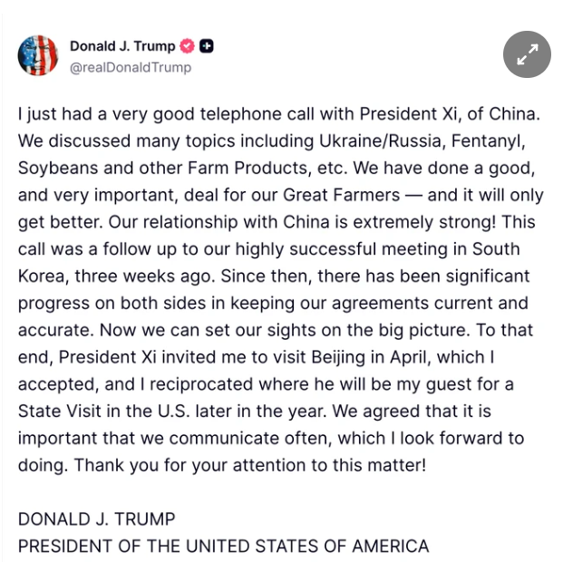 Bài đăng về cuộc điện đàm với Chủ tịch Trung Quốc Tập Cận Bình của ông Trump trên Truth Social.