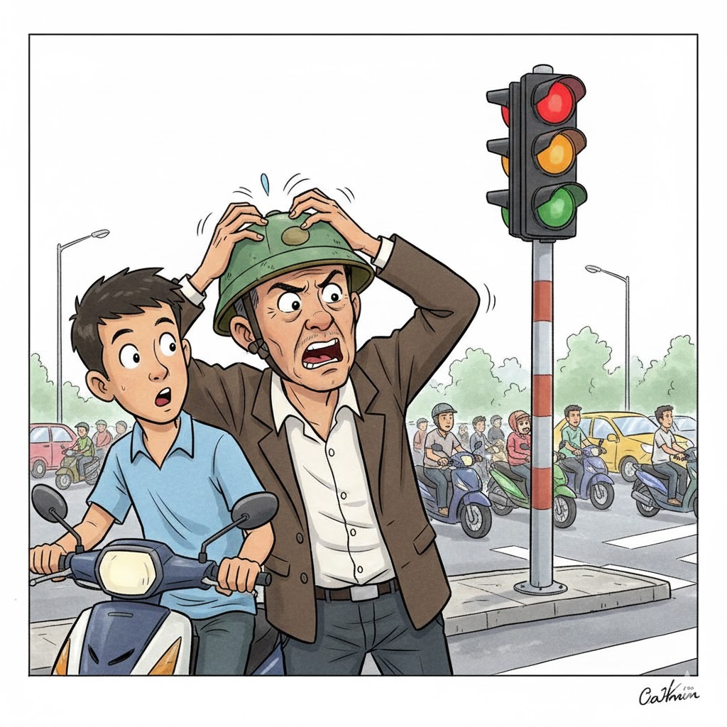 Anh thanh niên đứng hình. Đèn xanh chưa kịp bật, mà mặt đã chuyển sang… đỏ!