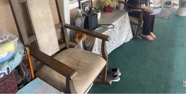 Chiếc ghế ngả trên hiên nhà bà Tran trước khi bị dẹp theo yêu cầu của ban quản lý. Ảnh: USC