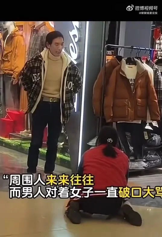 Theo truyền thông đại lục, sự việc xảy ra vào một ngày đông rét buốt. Trong video, người phụ nữ mặc chiếc áo cũ bạc màu, đôi giày bông đã mòn, toàn thân run rẩy vì lạnh. Cô quỳ trên nền gạch lạnh, liên tục nhỏ giọng thuyết phục chồng, hy vọng được mua một chiếc áo phao mới để chống chọi thời tiết. Thế nhưng người chồng ăn mặc chỉn chu với áo len cổ lọ và áo khoác đắt tiền lại tỏ ra hoàn toàn thờ ơ. Anh đứng khoanh tay, lạnh lùng từ chối và nhiều lần quát nạt vợ trước sự chứng kiến của đám đông.