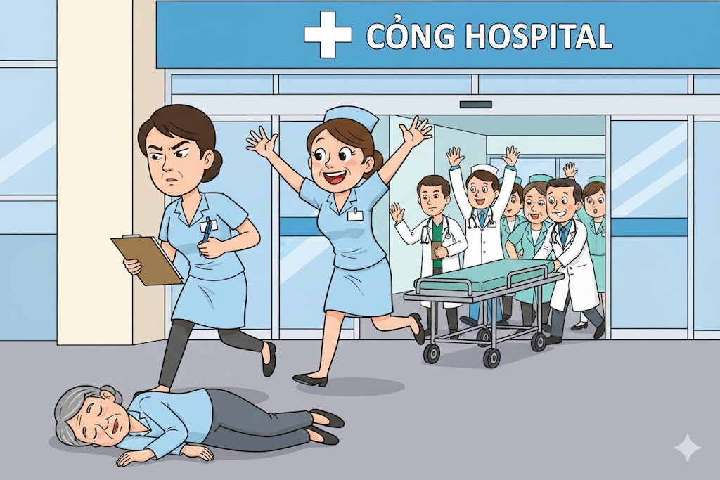 Ngay lập tức, cáng, bác sĩ, máy thở, xe đẩy… xuất hiện như phim hành động. Bà cụ được đưa vào phòng cấp cứu với tốc độ ánh sáng.