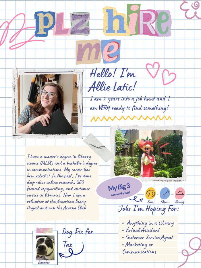 Trong một lần tuyệt vọng, quá chán nản với việc phải sửa CV và cover letter đến hàng trăm lần, Allie quyết định thử làm 1 chiếc ảnh meme "rao bán bản thân" cho đỡ chán. Cô tạo một bức h́nh với tiêu đề "Please Hire me" (Tạm dịch: Làm ơn, hăy thuê tôi đi) và gửi cho bạn bè. Ban đầu, đó chỉ là cách Allie tự đùa với với cơn buồn chán của ḿnh, nhưng bạn bè cô lại động viên: Thử đăng lên Facebook, các hội nhóm tuyển dụng đi, biết đâu được đấy!