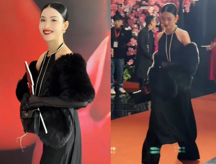 Tại sự kiện, Mai Hồ xuất hiện đầy cuốn hút trong bộ đầm đen dáng dài ôm sát cơ thể, thiết kế cổ yếm khoe trọn bờ vai thanh mảnh và xương quai xanh gợi cảm. Cô phối cùng áo khoác lông tông đen sang trọng, găng tay voan mỏng và dây chuyền dáng dài tạo điểm nhấn tinh tế, mang hơi hướng cổ điển pha chút quý phái. Kiểu tóc rẽ ngôi giữa được búi gọn phía sau giúp gương mặt thêm sắc sảo, nổi bật cùng lớp trang điểm nền mịn, eyeliner thanh mảnh và son đỏ tươi rạng rỡ.