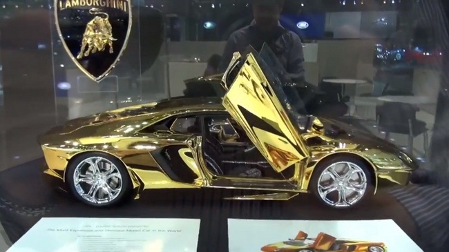 Đoạn video dưới đây được Shmee150 thực hiện, cho thấy chiếc Lamborghini Aventador mô hình bằng vàng và bạch kim hiện đang được trưng bày tại Dubai Motor Show 2013.