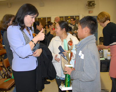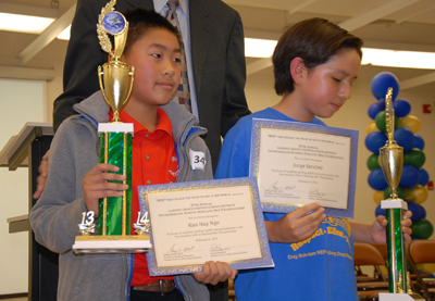 Luật Sư Nguyễn Quốc Lân (trái), đại diện Hội Đồng Giáo Dục Học Khu Garden Grove, trao cúp giải nhất Spelling Bee cho em Kim Huy Ngô sau cuộc thi. (Hình: Linh Nguyễn/Người Việt)