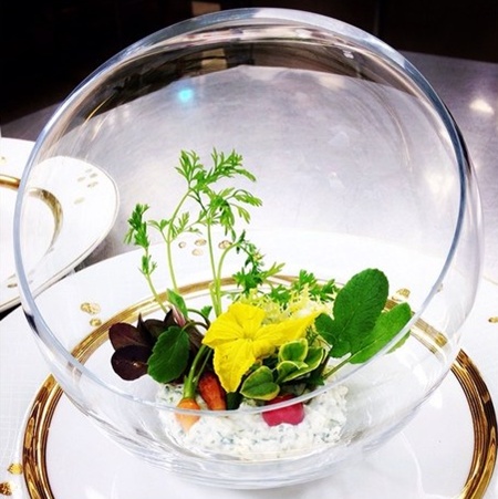 Sa lát "Khu vườn Mùa đông" với rau, củ lấy từ vườn của Nhà Trắng, với nước sốt là mật ong từ tổ ong ở khu vực Bãi cỏ phía Nam của Tòa Bạch Ốc. Món sa lát được bài trí trong một chiếc bình, tạo cảm giác như một khu vườn nhỏ. Ảnh: Whitehouse