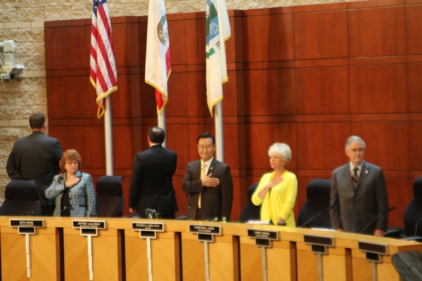 Đúng 4 giờ, Thị Trưởng Steven S.Choi, Ph.D. – Phó Thị Trưởng Jeffrey Lalloway, và các Nghị Viên Beth Krom, Christina She, Larry Agran cùng ông Sean Joyce (City Manager), ông Todd Q.Litfin (Luật sư Thành phố) tiến đến các chỗ ngồi đã ấn định trước mặt mọi người. Phía bên trái gồm một số viên chức thành phố và các Thư Ký.